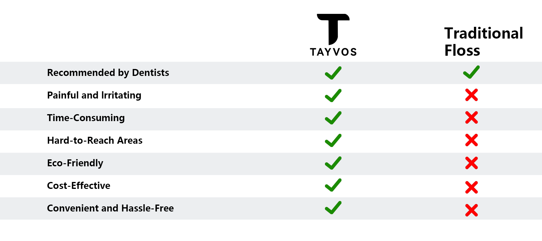 The Tayvos Water Flosser uses gentle, powerful pulses of water to effectively remove 99.9% of plaque, food particles, and stains – even from areas where traditional dental floss can not reach.