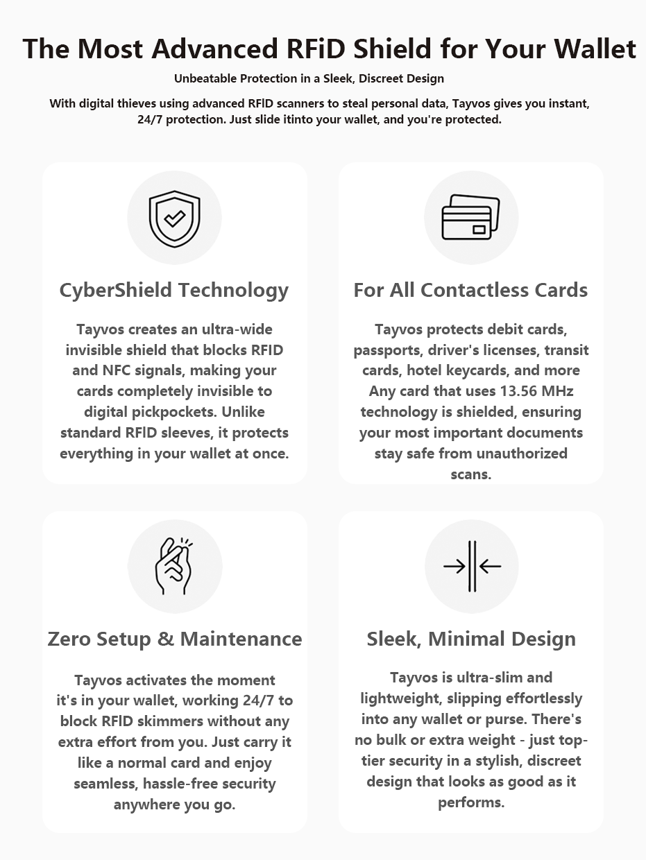 Tayvos uses advanced RFID-blocking technology to create a 5cm electronic shield around your cards. This instantly blocks skimmers and unauthorized RFID/NFC scans, keeping your credit cards, IDs, and passports safe in crowded places like airports, malls, and public transport.